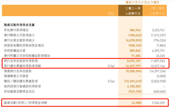 佳兆业2021年半年报显示,今年上半年,佳兆业融资性现金流净额,从去年同期的93.37亿元,大幅减少至-498万元。与此同时,佳兆业从银行及其他的借款获得的款项为80.92亿元,同比减少31.47%;而其通过优先票据所得的款项净额为163.38亿元,同比增加55.20%。
