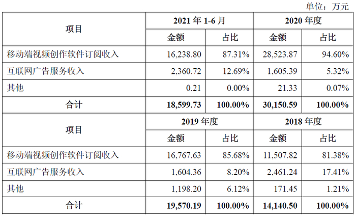 其中,移动端视频创作软件订阅收入分别为1.15亿元、1.68亿元、2.85亿元和1.62亿元,占当期主营业务收入的比例分别为81.38%、85.68%、94.60%和87.31%。互联网广告服务收入分别为2461万元、1604万元、1605万元和2361万元,占当期主营业务收入的比例分别为17.41%、8.20%、5.32%和12.69%。可以看到,该公司视频创作软件订阅收入所占比例持续增长,是公司的主要营业收入来源。
