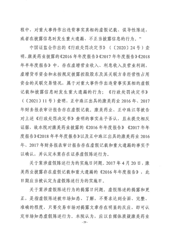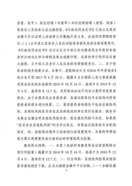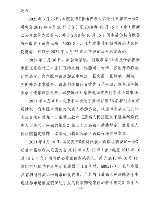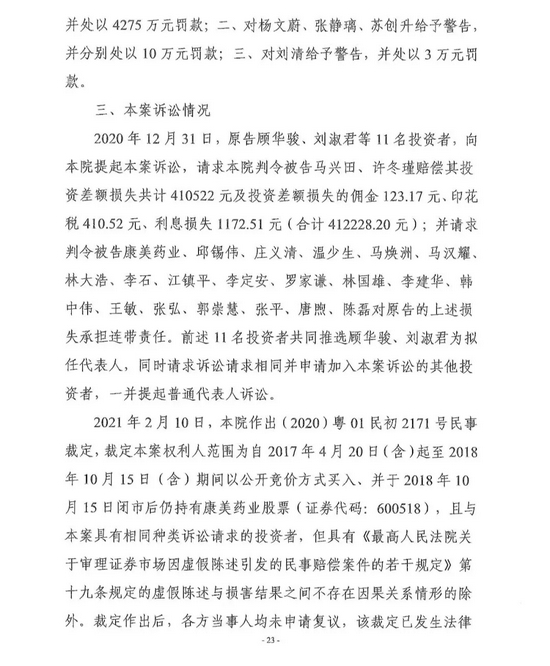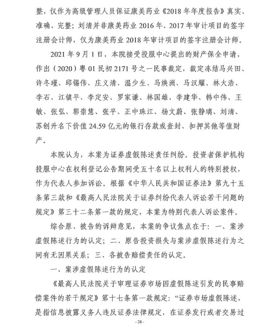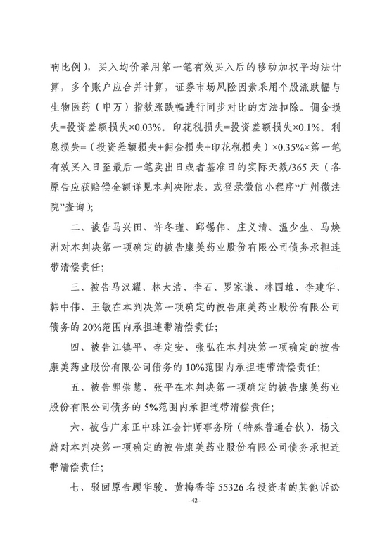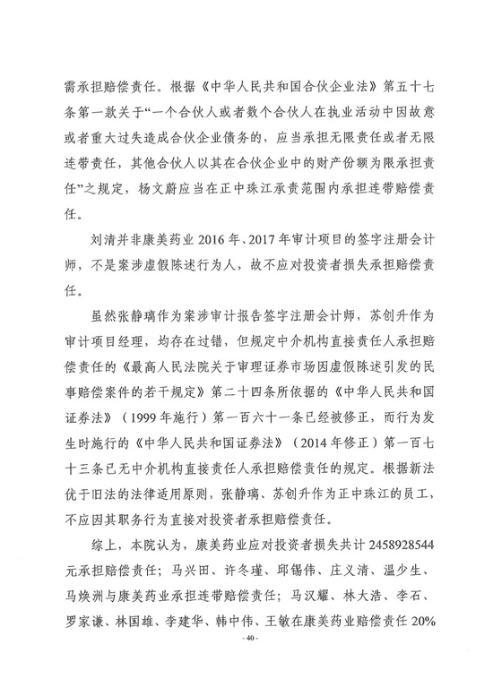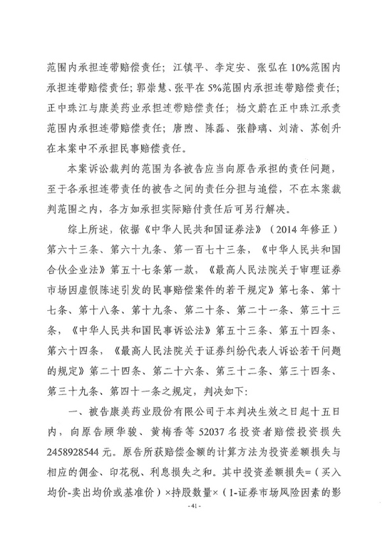广州市中级人民法院对全国首例证券集体诉讼案作出一审判决,责令康美药业股份有限公司因年报等虚假陈述侵权赔偿证券投资者损失24.59亿元,原董事长、总经理马兴田及5名直接责任人员、正中珠江会计师事务所及直接责任人员承担全部连带赔偿责任,13名相关责任人员按过错程度承担部分连带赔偿责任。