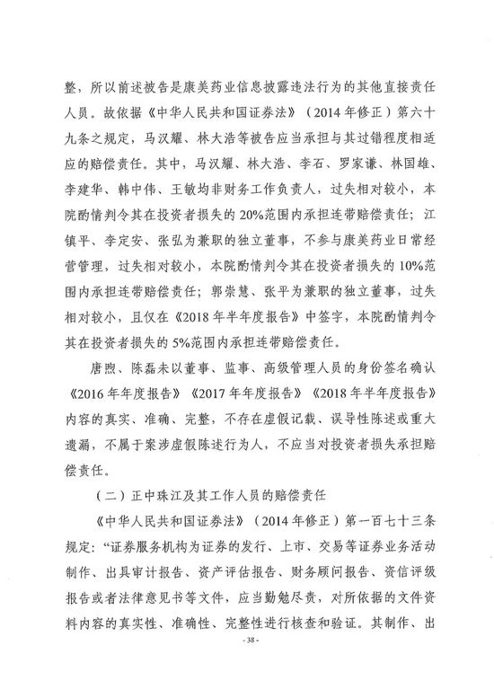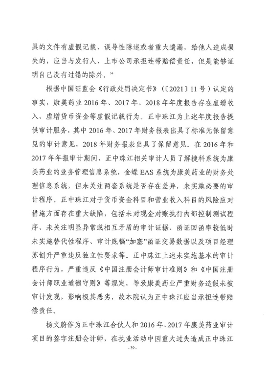 审计机构正中珠江会计师事务所未实施基本的审计程序,承担100%的连带赔偿责任,正中珠江合伙人和签字会计师杨文蔚在正中珠江承责范围内承担连带赔偿责任。