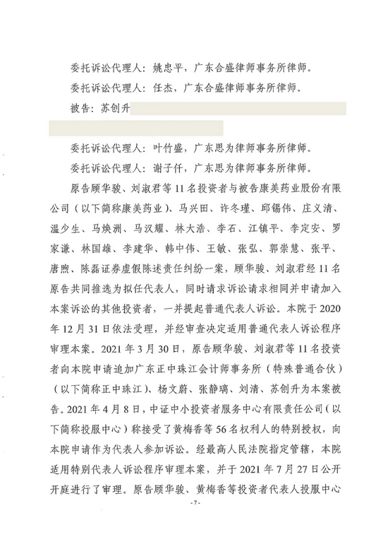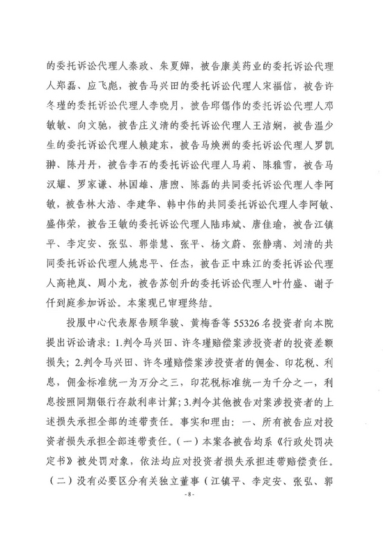 证监会表示,此次法院依法作出一审判决,示范意义重大,是落实新《证券法》和中办、国办《关于依法从严打击证券违法活动的意见》的有力举措,也是资本市场史上具有开创意义的标志性案件,对促进我国资本市场深化改革和健康发展,切实维护投资者合法权益具有里程碑意义。下一步将在全面总结首单案件经验的基础上,推动完善代表人诉讼制度机制,支持投资者保护机构进一步优化案件评估、决策、实施流程,依法推进特别代表人诉讼常态化开展。