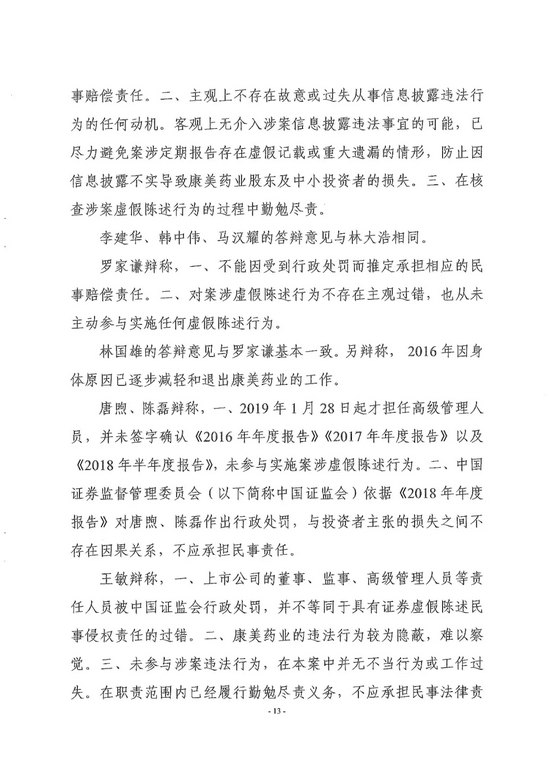 另有13名高管人员按过错程度分别承担20%、10%、5%的连带赔偿责任。