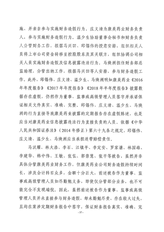 公司实际控制人马兴田夫妇及邱锡伟等4名原高管人员组织策划实施财务造假,属故意行为,承担100%的连带赔偿责任;