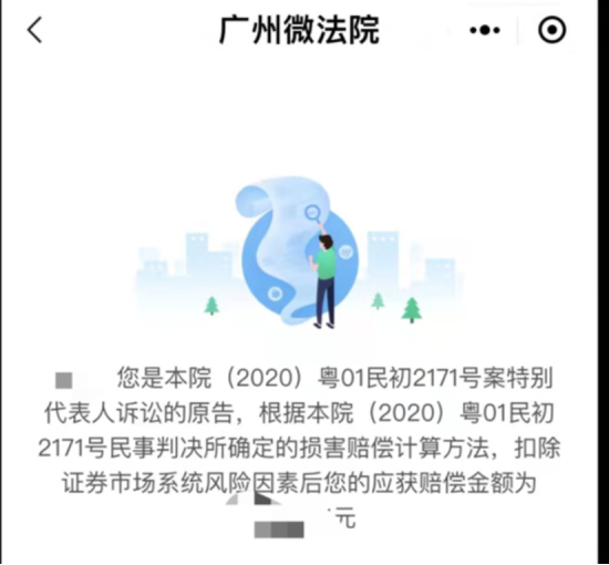 根据广州中院公告,投资者可以通过微信小程序搜索“广州微法院”,进入广州微法院点选页面下方“微诉讼”栏目,选择“代表人诉讼入口”,进入代表人诉讼通过平台查询是否属于适格的原告以及具体赔偿金额。