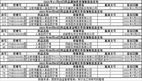 截至2021年7月24日,根据国家药监局网站数据显示,国内已获批11种血源性凝血因子Ⅷ药品,其中泰格医药注射用重组人凝血因子Ⅷ已经获批。