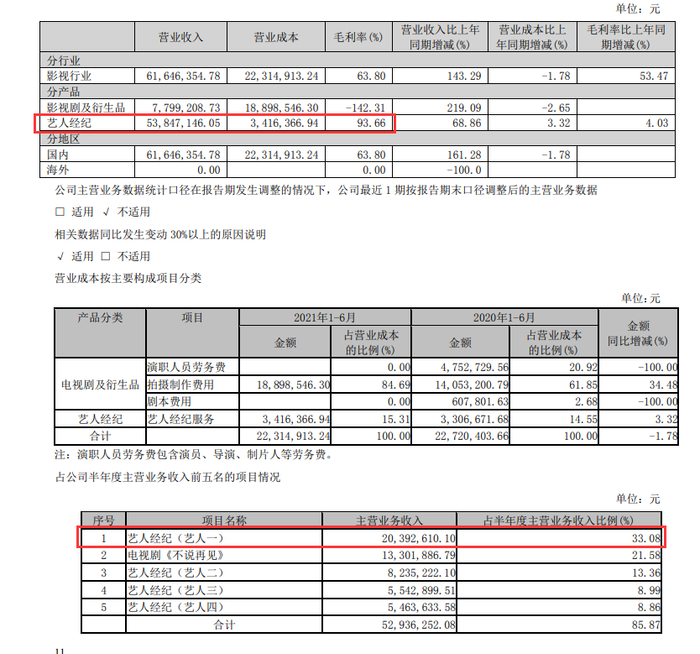 在5384.71万元的艺人经纪收入中,艺人一贡献了2039.26万元,占该公司上半年总营收的33.08%,而这个艺人一,被外界认为是杨紫;艺人二、艺人三、艺人四贡献的营收分别为823.52万元、554.29万元、546.36万元。