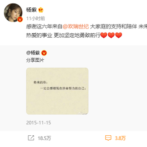 随后,欢瑞世纪转发了上述微博,并送上祝福:“杨紫一路以来的成长和取得的成绩,我们共同经历与见证,诚挚祝愿杨紫女士未来绚烂如花,星途璀璨。”