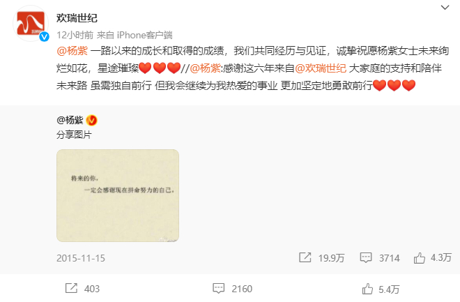 11月15日早间,演员杨紫在微博发文称,“感谢这六年来自欢瑞世纪大家庭的支持和陪伴,未来路,虽需独自前行,但我会继续为我热爱的事业,更加坚定地勇敢前行。”杨紫还在该条微博下发评论称,接下来!加油啊啊啊啊啊啊!。