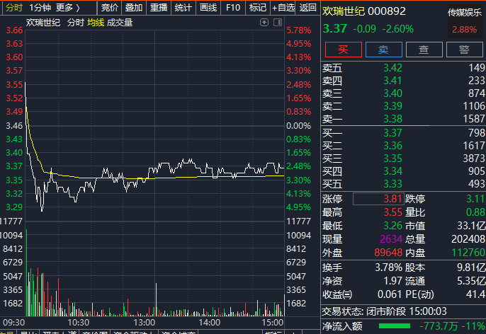 最终,欢瑞世纪股价收跌2.6%,报3.37元/股,市值为33亿元。