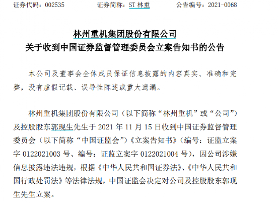 11月15日,ST林重公告,因公司涉嫌信息披露违法违规,证监会决定对公司及控股股东郭现生立案。