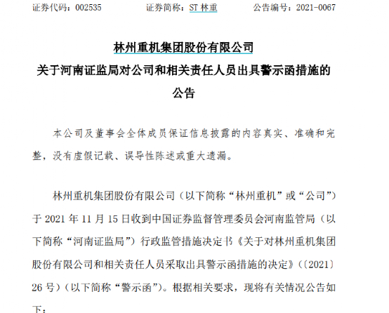 同日,ST林重公告称,林州重机于2021年11月15日收到河南证监局行政监管措施决定书《关于对林州重机集团股份有限公司和相关责任人员采取出具警示函措施的决定》(以下简称“警示函”)。
