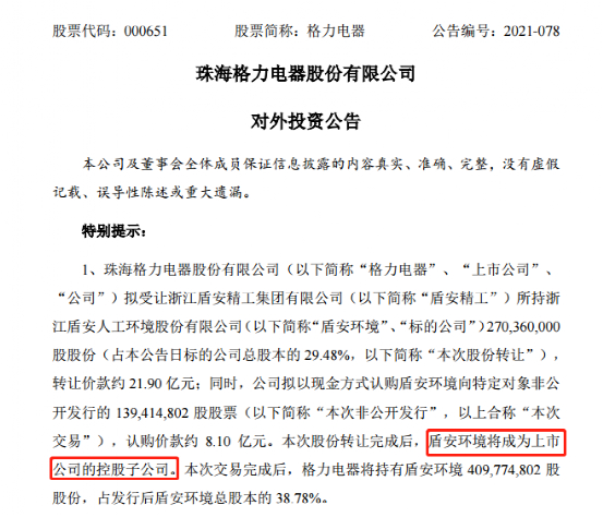 根据公告,格力电器与盾安精工于2021年11月16日签署了《股份转让协议》,格力电器拟受让盾安精工持有的2.7亿股盾安环境股份,占公告日盾安环境总股本的29.48%,每股转让价格为8.1元,格力电器应支付的标的股份转让价款总额为21.9亿元。根据《股份转让协议》的相关约定,格力电器将有权改组董事会,并提名半数以上的董事,盾安环境将成为格力电器的控股子公司。