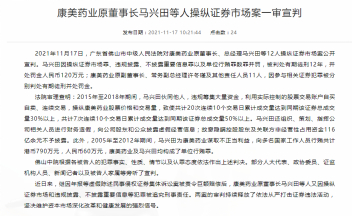 2021年11月17日,广东省佛山市中级人民法院康美药业原董事长、总经理马兴田等12人操纵证券市场案公开宣判。