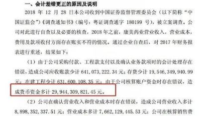 可惜“打脸”来得太快,一记响亮的“耳光”来自于康美药业姗姗来迟的2018年年报,在证监会启动立案调查后,不仅漂亮的财务数据不再有,其还发布了一则《关于前期会计差错更正的公告》,宣告300亿资金“不翼而飞”——由于财务数据出现会计差错,造成2017年货币资金多计入299亿元,另外,营业收入多计入88.98亿元,营业成本多计入76亿元,销售费用少计入5亿元,财务费用少计入2亿元,销售商品多计入102亿元,筹资活动有关的现金项目多计入3亿元。