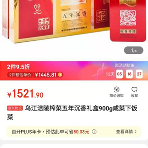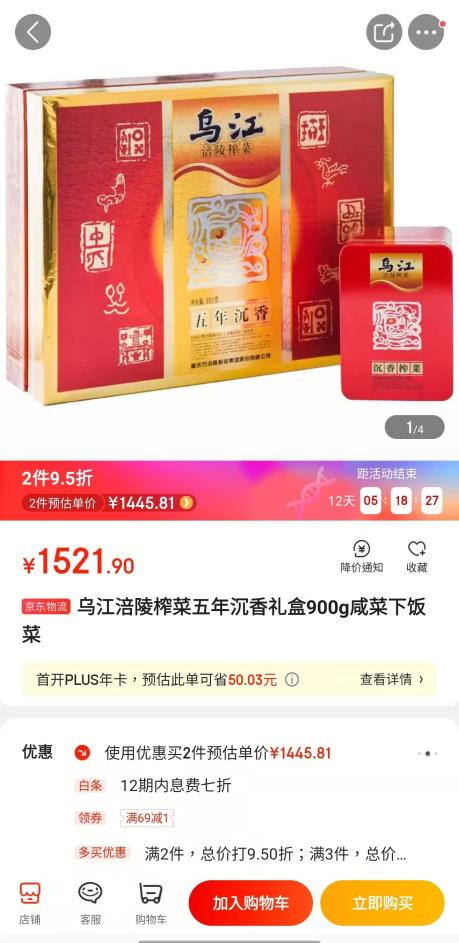 随后,银柿财经记者在京东平台找到了该款商品。1521.9元900g的“沉香榨菜”,售价的确超过一瓶原价(1499元)的53度500ml飞天茅台酒。