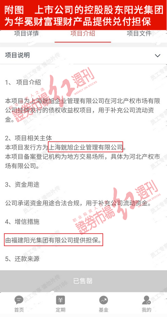 《红周刊》记者获得的一份产品发行资料也显示,华冕财富发行了不少在地方金交所挂牌的定融产品,譬如某产品的发行人为福建万众资产,天眼查显示,万众资产是阳光控股的全资子公司。而且其发行的不少定融理财产品,由上市公司大股东、福建阳光集团提供担保。