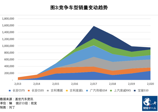 比如长安CS35,年销量在2013年为7.6万辆,到2017年提升到15.2万辆,长安CS75在2014年为5.3万辆,2017年则上升到24万辆;吉利博越年销量在2016年为10.9万辆,2017年大幅扩张到28.7万辆;宝骏510也在2017年加入竞争,当年销量就达到36.4万辆。