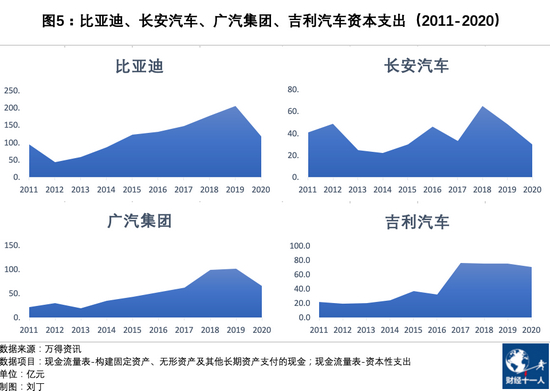 相比起来,比亚迪和广汽集团的资本支出,是每年逐步增加;长安汽车则是起伏不定;吉利汽车则是从2017年才开始显著提升。