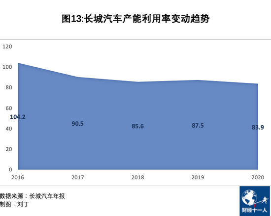 而长城汽车的总销量自2016年到2020年,已经停止快速增长,仅从107万辆增长到111万辆,同时产能利用率从2016年的104.2%,下降到2020年的83.9%。