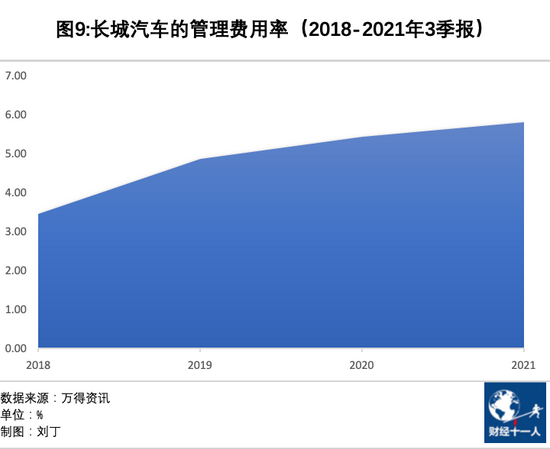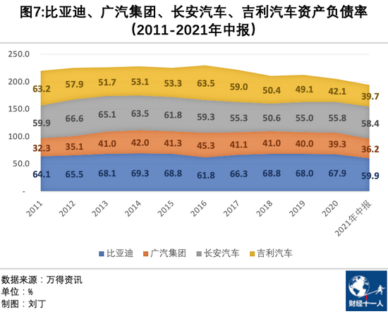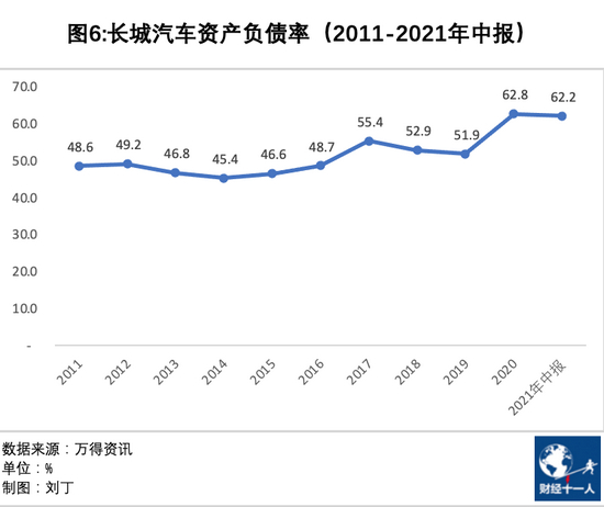 截止2021年半年报,长城汽车的资产负债率为62.2%,比2011年上升13.6个百分点,位列可比同行首位。