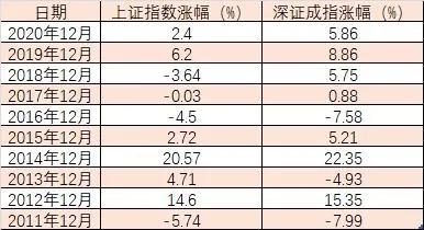 回顾过去10年(2011年至2020年的12月份A股行情表现,上证指数共有6次上涨,深证成指有7只上涨。因此,12月份A股上涨概率较高。