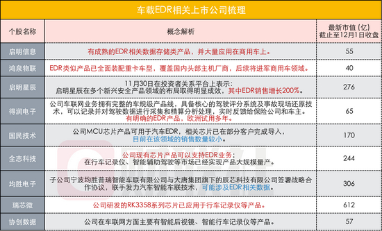 财联社对于涉及车载EDR业务的上市公司进行了梳理:启明信息、鸿泉物联、启明星辰、得润电子已有成熟的EDR产品;还有一些上市公司具备生产EDR产品的技术能力。
