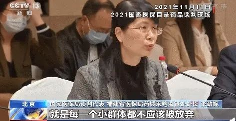 11月11日,2021年国家医保目录药品谈判现场,福建省医保局药械采购监管处处长张劲妮作为国家医保局谈判代表再现“灵魂砍价”。