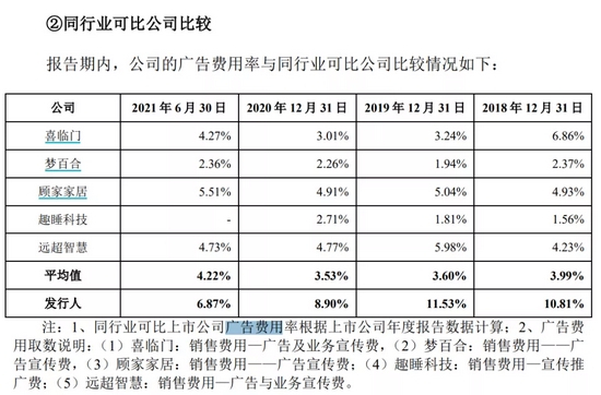从招股书可以看出,慕思股份极其依赖于营销宣传。2018年- 2021年上半年,公司广告费分别为3.45亿元、4.45亿元、3.96亿元、1.93亿元。广告开支中最大的两个场景,分别是冠名赞助和公共交通广告。报告期内,公司广告费用占营业收入的比例分别为10.81%、11.53%、8.90%和6.87%,远超行业整体水平。
