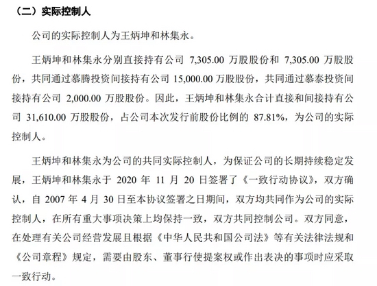 两人合计直接和间接持有公司31610万股股份,占公司本次发行前股份比例的 87.81%。王炳坤和林集永均为中国国籍,无境外永久居留权。