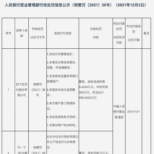 而这已经不是拉卡拉第一次领罚单。最近的一次是在今年1月4日,央行南宁中心支行公告称,因未准确标识并完整发送交易信息,以确保交易信息真实、完整、可追溯以及在支付全流程中的一致性,对拉卡拉支付股份有限公司广西分公司作出行政处罚,罚款3万元。
