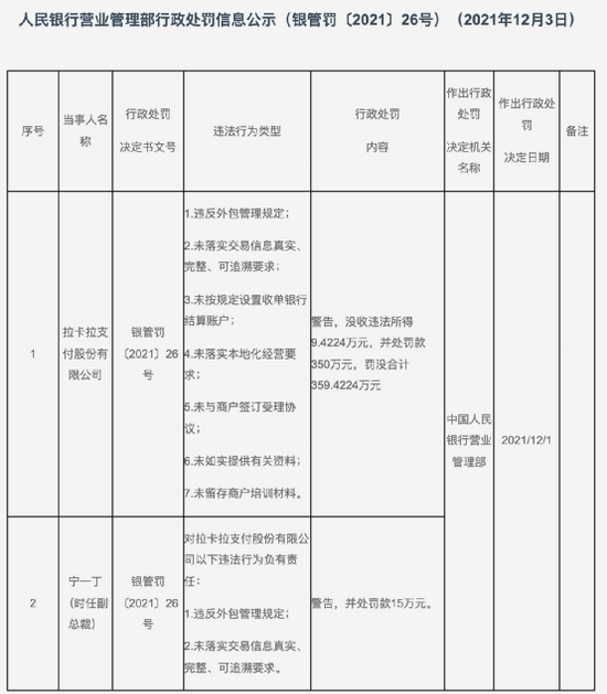 拉卡拉因上述行为被警告,并遭没收违法所得9.4224万元,以及被处罚款350万元,罚没合计359.4224万元。同时,时任拉卡拉副总裁的宁一丁因对拉卡拉违反外包管理规定和未落实交易信息真实、完整、可追溯要求的违法行为负有责任,因此被警告并罚款15万元。