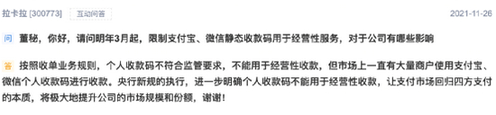 此前,拉卡拉刚刚因蹭热度“翻车”。11月26日,拉卡拉在互动易平台回复投资者时表示,“近日央行发布的《中国人民银行关于加强支付受理终端及相关业务管理的通知》,明确个人收款码不能用于经营性收款,将极大地提升公司的市场规模和份额。”