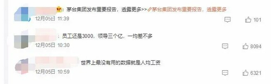 在新浪热搜微博话题#贵州茅台员工人均年薪31万#下,有“世界上最没用的数据就是人均工资”“员工还是3000,领导1个亿,一均差不多”的言论获得近万点赞。