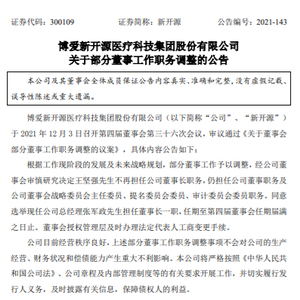 12月3日晚间,新开源发布公告,在当日召开的董事会上,审议通过了《关于董事会部分董事工作职务调整的议案》。根据议案,经董事会审慎研究决定王坚强不再担任公司董事长职务,仍担任公司董事职务及公司董事会战略委员会主任委员、提名委员会委员、审计委员会委员职务。同意选举张军政为董事长。