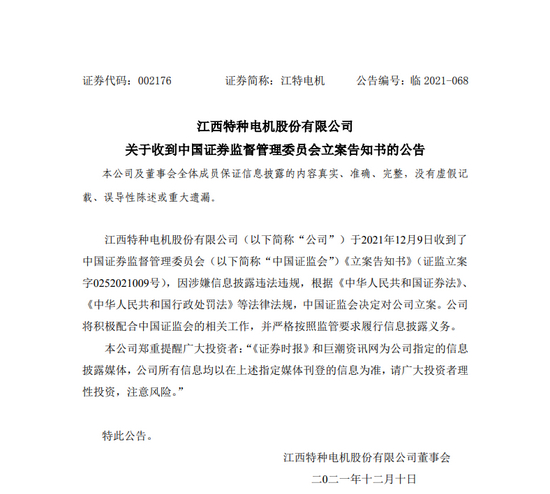 12月9日晚间,江特电机发布公告称,公司于2021年12月9日收到了中国证监会《立案告知书》(证监立案字0252021009号),因涉嫌信息披露违法违规,根据《中华人民共和国证券法》、《中华人民共和国行政处罚法》等法律法规,中国证监会决定对公司立案。