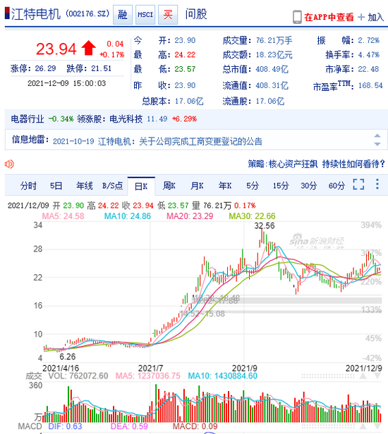 截至12月9日收盘,江特电机报23.94元/股,最新市值408.5亿元。