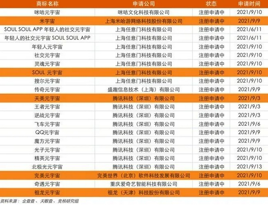事实上有多家知名厂商相继注册元宇宙商标,例如腾讯的“王者元宇宙”、“QQ元宇宙”,米哈游的“米宇宙”,爱奇艺的“奇遇元宇宙”以及完美世界的“完美元宇宙”等。