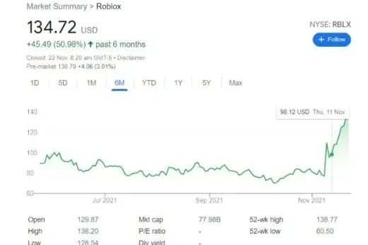 2021年 3 月,Roblox 在纽交所上市,上市当天市值一度逼近 400 亿美元,如今市值接近770亿美元。早在2020年 2 月 Roblox完成1.5 亿美元 G 轮融资中,腾讯就已经参投,并且独家代理 Roblox 中国区产品发行。