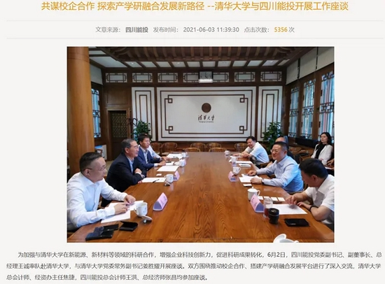 今年1月清华大学曾携人工智能数据开发服务项目与四川能投开展座谈;随后四川能投相关领导在6月初率队赴清华大学,双方围绕推动校企合作、搭建产学研融合发展平台进行了深入交流,彼时清华大学方面表示希望与四川能投携手,持续推进校企对接,深化新能源、新材料等领域合作,探索产学研融合发展新路径,为实现碳达峰、碳中和目标作出应有贡献。