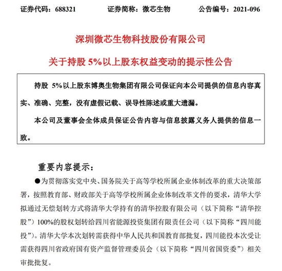 加上12月12日晚最新发布公告的微芯生物,这个周末共有8家拥有“清华系”背景的A股公司发布了关于“清华大学拟无偿划转清华控股100%股权”的相关公告,清华大学的校企改革工作正在加速进行。