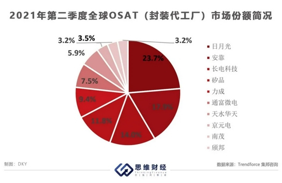 在封测厂商市场份额排名方面,根据Trendforce集邦咨询报告,2021第二季度,日月光作为全球龙头销售收入占据了23.7%的市场份额,其次是安靠(Amkor),占比17.9%,通富微电则以7.5%的市场份额,排名第六。