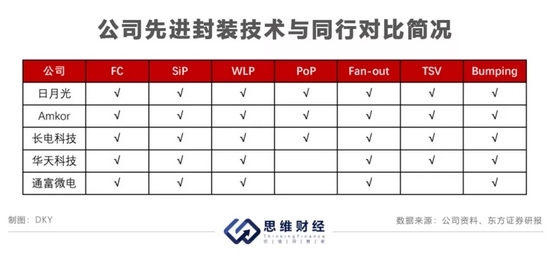在先进封装技术方面,对比日月光、安靠(Amkor)、长电科技、华天科技,公司在PoP(堆叠封装)及TSV(硅通孔封装技术)上有所缺失。