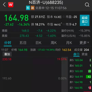 百济神州发行价格为每股192.6元,仅次于禾迈股份(557.80元/股)和义翘神州(292.92元/股),系年内第三高价股。该股开盘破发,跌8.12%。随后股价继续跳水,百济神州今日上午最低报155.02元/每股,跌19.51%。