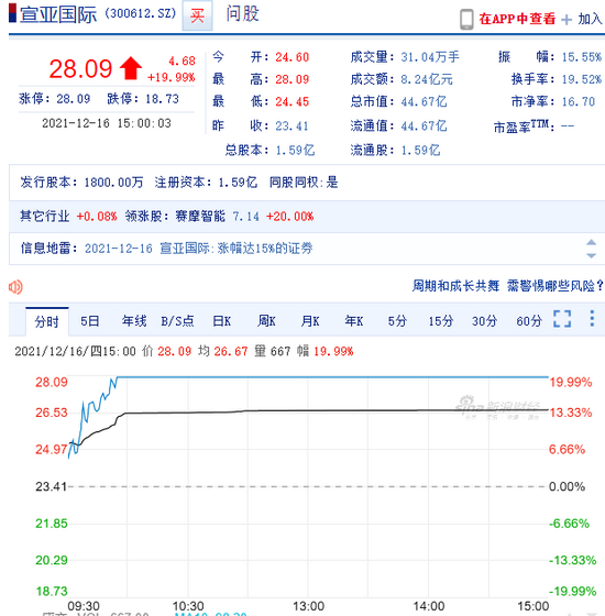 二级市场上,截至今日收盘,宣亚国际连收4个20cm涨停,股价报28.09元,最新总市值为44.67亿元。