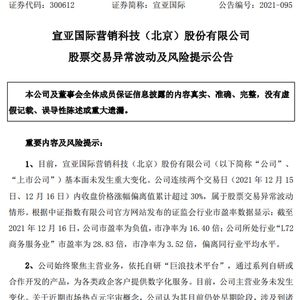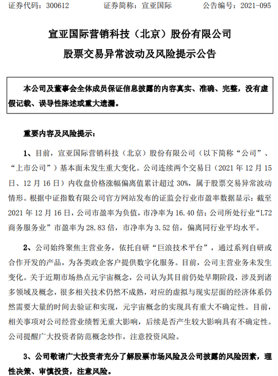 早在12月14日晚间,在关于股票交易异常波动的公告中,宣亚国际表示,公司在互动平台回复了元宇宙概念相关问题,同时进行了风险提示。