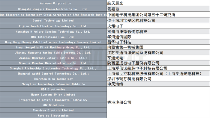 在周四的公告中,美国商务部给出的借口包含所谓“违反美国外交政策或国家安全利益”等。根据公告,周四被纳入“清单”的实体涉及到多家A股上市公司或母子公司。其中A股公司包括航天晨光、景嘉微、火炬电子、杭州海康微影传感科技、内蒙一机、亨通光电、中天科技,以及新三板公司亚成微。