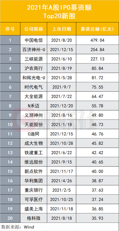 个股方面,今年8月份回A的中国电信成为今年二级市场的新晋“巨无霸”,募资额为479.04亿元,在历年IPO项目中排名第7。排在第2的是首家“三地上市”明星药企百济神州,募资额为254.84亿元。三峡能源紧随其后,募资227.13亿元成中国电力行业历史上规模最大IPO。