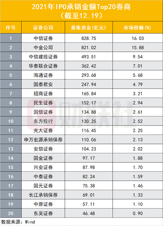 IPO募集资金Top10的券商还包括:海通证券(293.68亿元)、国泰君安(247.94亿元)、招商证券(165.84亿元)、民生证券(152.17亿元)、国信证券(134.88亿元)、东方投行(130.25亿元)。