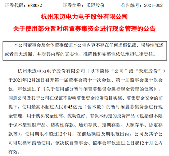 禾迈股份(688032)12月20日晚间公告,拟使用最高不超过45亿元暂时闲置募集资金进行现金管理,用于购买安全性高、流动性好、有保本约定的投资产品。