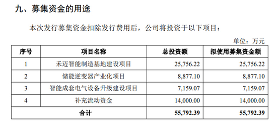 值得注意的是,根据招股说明书显示,禾迈股份本次发行募集资金的用途将投资于禾迈智能制造基地建设项目2.58亿元、储能逆变器产业化项目8877万元、智能成套电气设备升级建设项目7159万元和补充流动资金1.4亿元。合计拟使用募集资金额为5.58亿元。